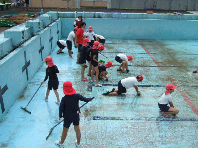 6月7日に5・6年生でプール掃除を行いました。プールの底にたまった土や落ち葉を集め、たわしできれいに磨きました。来週からの水泳がとても楽しみです。