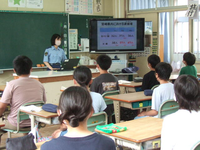 6月8日に宮崎県警察本部、都城地区少年サポートセンターの講師の方を招いて、非行防止教室が行われました。対象学年は、5年生と6年生で、それぞれの学級で映像等も使いながらのとても分かりやすい授業でした。今回は、大麻や麻薬などに関する薬物の恐ろしさについて学びました。