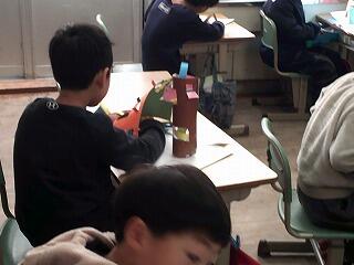 2年生が厚紙を使った立体工作に挑戦しています。角柱や円筒形のものを組み上げ、窓状の隙間をカッターナイフで切り抜いて作っていました。普段使い慣れていないカッターナイフを慎重に動かしていました。平らな状態の厚紙を何度も曲げながら、「こことここがくっつくから、ここを切り取ろう」とできあがりを意識しながら作業を進める様子も見られました。できあがりが楽しみです。