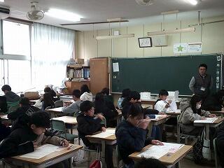 6年生が英検サポートプログラムというテストにチャレンジしました。内容はヒアリングとリーディング、英語に関するアンケートから構成されています。児童から話を聞くと、ヒアリングよりやはり英単語や英文を読んで回答するリーディングが難しかったようです。マークシートの解答用紙も記名から英語(ローマ字)なので、みんな一つずつ丁寧に確認しながら準備を進めていました。