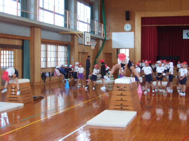 体育教員の派遣事業で跳び箱に挑戦しました。準備運動や体を柔らかくする柔軟運動などで体を慣れさせた後に、いざ、跳び箱に挑戦です。1日目は、跳び箱がどれぐらいできるのかの力試し的な活動から入りました。2日目は、一人一人の目標に応じた場の設定により、楽しく活動できたようです。