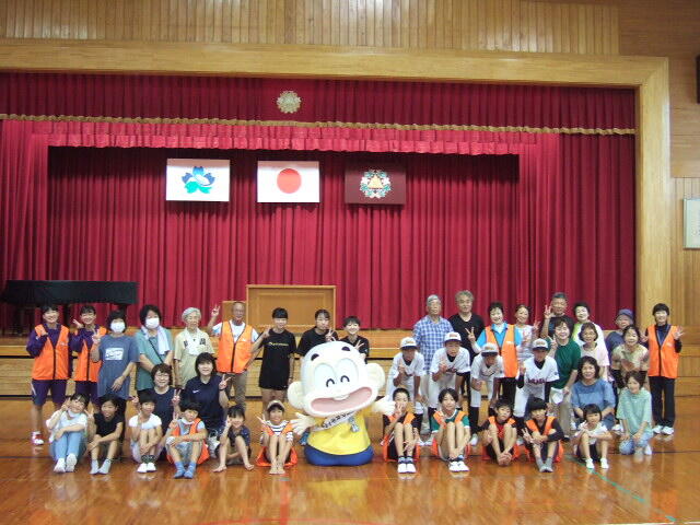 7月30日(日)に、山田地区まちづくり協議会主催の山田町一斉ラジオ体操が、山田地区内の3小学校を会場に行われました。本校では、山田中生2名、本校児童6名がボランティアとして楽しく参加しました。本校には、マスコットキャラクターの「ぼんちくん」も登場し、サプライズに会場は、大いに盛り上がったラジオ体操となりました。