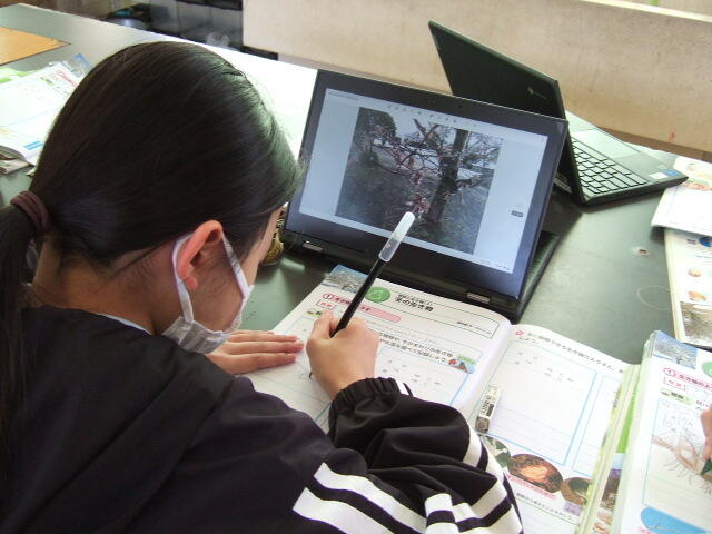 4年生の理科では、「冬の生き物」の学習に入っています。冬の気温や生き物の生態等を観察して、四季折々の生き物の移り変わりを自然を通して学んでいきます。本日は、夏や秋とはずいぶん様変わりした木々の様子を観察し、タブレットで写真として記録しました。記録した写真を使って気付いたことを理科ノートにまとめて新たな発見につなげることができました。