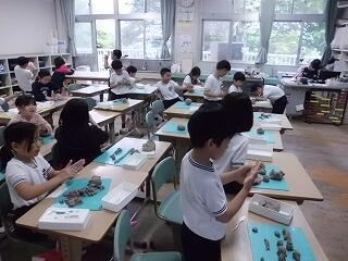 2年生の教室から楽しげな雰囲気が伝わってきました。のぞいてみると2年生が図画工作の時間で粘土を使って造形活動をしていました。家やお寿司、恐竜など思い思いの形を作り、お互いの作品へのコメントが楽しそうに響き合っていました。