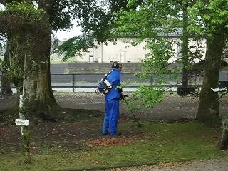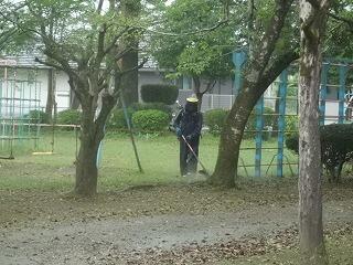 4月15日(月)に市の教育総務課の環境美化作業員2名が、除草作業等で来校しました。この日はあいにくの雨でしたが、刈払機を使って整備を進めていただきました。緑の豊かな学校の敷地ですので職員や児童でもできる範囲で整備をしますが、どうしても対応しきれないところもあります。月に2回程度来ていただけるのは、とてもありがたいです。