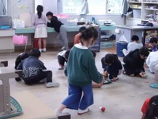 2年生の教室から楽しげな雰囲気が伝わってきました。のぞいてみると2年生が図画工作の時間で粘土を使って造形活動をしていました。家やお寿司、恐竜など思い思いの形を作り、お互いの作品へのコメントが楽しそうに響き合っていました。