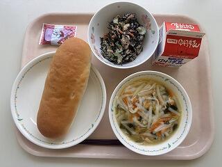 コッペパン ビーフンスープ ひじきとツナのマヨネーズサラダ マーシャルビーンズ 牛乳