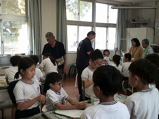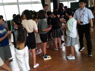 山田りんどう福祉会から6名の所員の方が来校され、1年生教室で防犯の合い言葉「いかのおすし」についてお話をしていただきました。これから夏休みを迎える1年生にとっても、ありがたい意識付けの機会となりました。最後に防犯グッズ等を一人一人いただき、子どもたちも大喜びでした。また、1年生の元気なあいさつ等で所員の方々も「元気をもらいました」と有意義な交流の時間がもてたことを喜ばれていました。