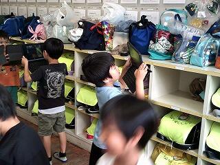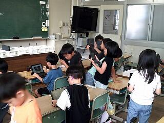 1年生がタブレットの操作をしています。これから生活科などで写真を撮って、観察記録をするための準備です。初めてのことが多いのですが、まずは、先生の支援を受けながら何とか自分のパスワードを入れて画面をひらき、カメラのアイコンを選択して押します。と、画面が切り替わり、周りの様子が映り込んだ瞬間、「わあ」「やった」と次々に歓声が上がりました。それから教室周辺のお気に入りを写真に収め、みんなとてもうれしそうでした。これから少しずつタブレットに慣れ、学習での活用が増えていくことになりますね。