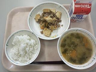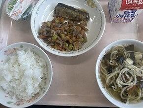 ごはん いわし生姜煮 こんにゃくとさつま揚げの炒め物 魚そうめん汁 天の川ゼリー 牛乳