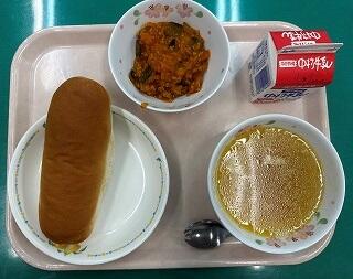 背割りパン ウインナー 日向夏ドレッシングサラダ 人参ポタージュ 牛乳