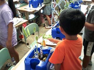 生活科の学習で一人一鉢にして育てていた野菜(ミニトマト・オクラ・トウモロコシ・キュウリなど)の生長の様子を互いに比べ合い、うれしそうにしていました。同じような種、同じような小さな芽から育ったはずなのに、葉の数や実の付き方、草丈など様々な違いが出てきました。これらの栽培をとおして、生き物の不思議や命の大切さ、お世話が大事なことなど様々な気付きにつながることでしょう。