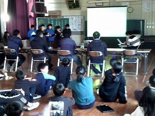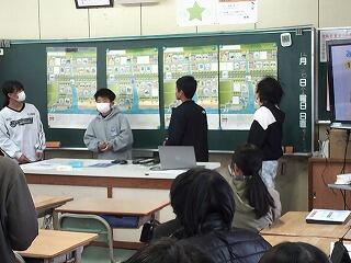 5年生が今年の田植え、稲刈りでお世話いただいたJA青年部の方々を招待して、子どもたちが収穫したお米で作ったおにぎりを食べていただき、また、総合的な学習の時間として取り組んだお米にまつわる発表を行いました。米の種類や農業機械、食品ロスなど様々な視点で調べたことをプレゼンを使って伝えました。最後には、子どもたちが考案した未来の農業や機械についてフォームを使って投票をしました。中には機械ではなく田んぼ自体を機械化するアイデアもあり、その発想の豊かさにJAの方も驚かれていました。