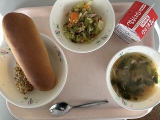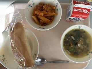 コッペパン 春雨のカレー炒め 中華卵スープ チョコレートネオソフト 牛乳