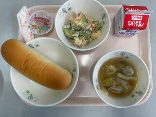 チーズパン ポテトサラダ 肉団子と春キャベツのスープ煮 おめでとうデザート 牛乳