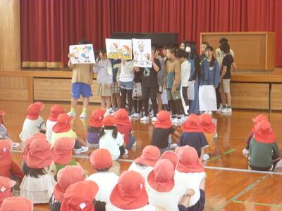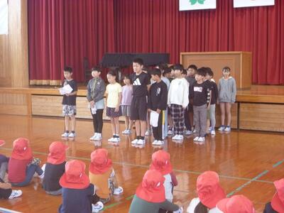 4月23日(水)の3校時に全校で1年生を迎える会がありました。最初に、5年生は学校の決まりについて、6年生は学校行事について1年生へ発表しました。