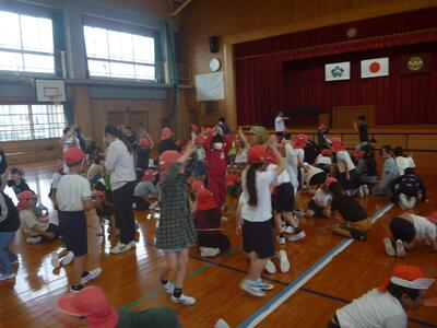 3年生の体育の学習です。この日は、いろいろな動きで体をほぐしたり、俊敏に体を動かす活動をしていたようです。この時は、フロアにうつ伏せになり、2人一組になって向かい合っていました。それぞれに追いかけるときと逃げるときのキーワードがあり、それが聞こえたらさっと体を起こし、一方は追いかけ、もう一方は逃げ始めます。キーワードを聞き漏らさないように体育館が静まり、キーワードとともに動作音と歓声がわきあがります。とても楽しそうに取り組んでいました。