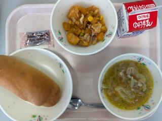 コッペパン タラとさつまいものみそがらめ コンソメスープ メープルジャム 牛乳