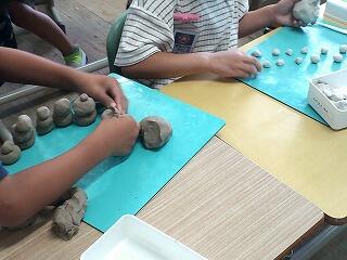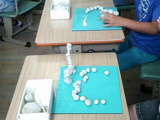 2年生が図画工作の学習で粘土を使っています。熱心に粘土を小さく丸めたものを作っています。それを粘土板の上に「好きなように並べてみよう」次に「積み重ねてみよう」そして、最後に「並べることと積み重ねることを組み合わせてみよう」とステップアップして造形を楽しんでいました。いろいろアイデアがわくようで一度作ったものをバラバラにして、再度チャレンジする姿も見られました。