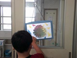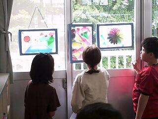 3年生が図画工作で箱の中に段ボールを使って形を作り、その模様に色セロファンをはることで、光にかざすときれいな模様が浮かび上がるすてきな作品を作っていました。できあがった作品を窓にはりつけ、友達同士鑑賞し合っていました。友達から良いところをほめられ、うれしそうな笑顔もたくさん見られました。