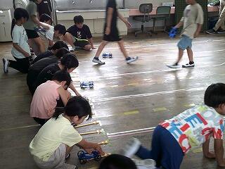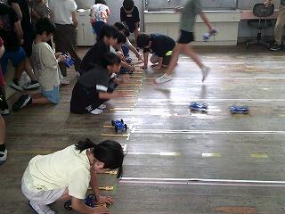 3年生がゴムや風の力で動く車の学習をしています。この日空いていた教室にコースを設定し、ゴムの引っ張り方の条件を変えてどのくらい車が走るかを実験しているようです。スタート位置に合わせて、ゴムを決められたところまで引っ張り手を離します。車を見守る子どもたちの目は少しでも遠くまで走ってほしいという思いがこもっているようでした。