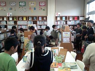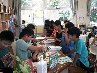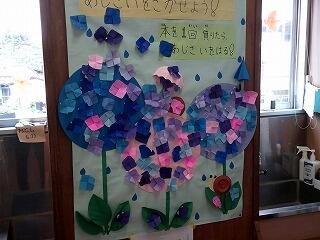 もうすぐ夏休み、この日は図書室が大賑わいでした。夏休み用の本の貸出しをしています。じっくり読める本を探すためにいつもより時間をかけて選んでいるようです。貸出しカウンターでは図書委員会児童が機器を操作して貸出しの手続きをしていました。図書委員会の本を借りてあじさいの花を咲かせる企画も花いっぱいになりました。長い時間のある夏休み、いいお話との出会いがあるといいですね。