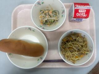 減量黒糖パン ジャージャー麵 もやしとささみのごまドレッシング和え 牛乳