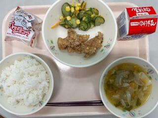 減量白ご飯 から揚げ コーンサラダ 米粉のガトーショコラ 牛乳