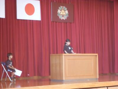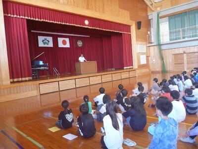 7月22日(火)の1校時に体育館で終業式を行いました。最初に、1学期がんばったことの発表を4年生と2年生の代表児童が発表してくれました。次に、校長先生のお話では、1学期中霧島小の子どもたちが頑張ったことや今年戦、後80年にあたることを受け、命や平和についての話をしてくださいました。