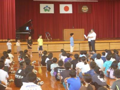 また、終業式終了後に、ベストリーダーの表彰も行いました。各学年の代表の児童が代表で賞状を校長先生から受け取りました。子どもたちが本に親しみ、夏休みもたくさんの本を読んでほしいです。