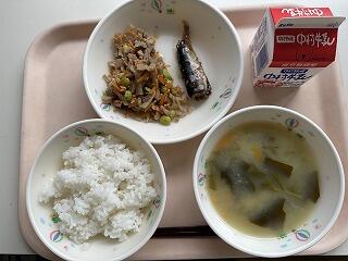 ごはん さんまおかか煮 れんこんのきんぴら 豆腐とわかめの味噌汁 牛乳