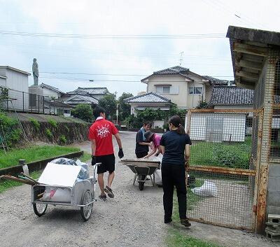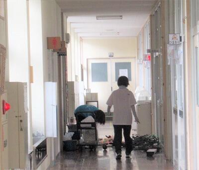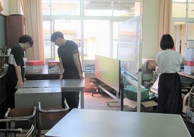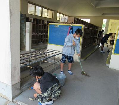 夏休みは、子供たちは学校に来ませんが職員は出勤しています。研修をする機会として活用したり、校内の環境整備を行ったりしています。今回は、職員作業の様子を紹介します。事務室の先生も総出で、汗びっしょりになりながら取り組みました。