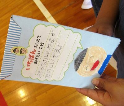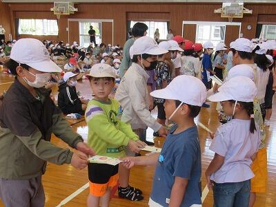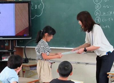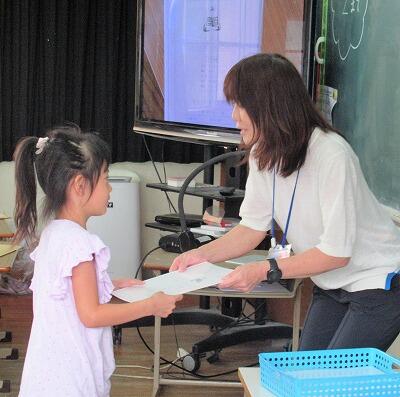 1年生は初めてもらう通知票です。担任の先生が一人一人のがんばったことを伝えながら、通知票を渡していました。ちょっと照れくさいけど皆うれしそうな様子でした。お家でもぜひ、がんばったことを褒めてあげてください。