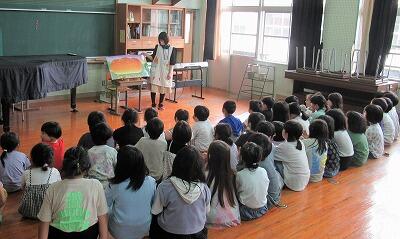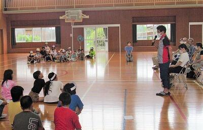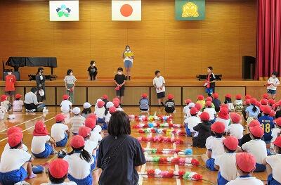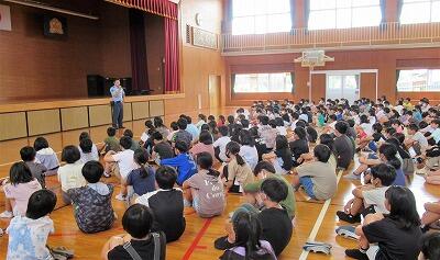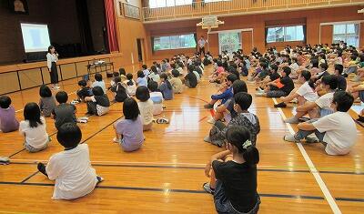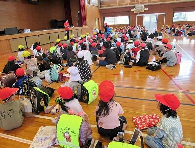 しかし、今回は、現在、感染レベルが1になっていることや、本校の状況を踏まえ、全校児童が体育館に集合して実施しましたよ。