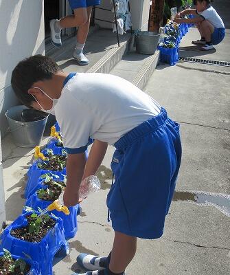 朝早く登校してきた3年生が、一人でもくもくとボランティアをしています。しばらくすると、次々に仲間が増えていき、あちらこちらでボランティアに取り組んでいました。