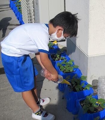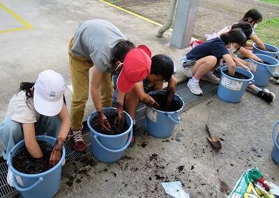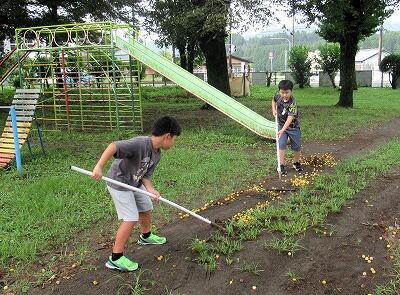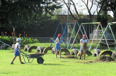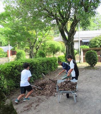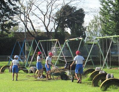 2学期のスタートから、5年生がボランティア活動をがんばっています。朝の運動場では、刈った草や落ち葉、銀杏の実などを集めたり、草取りをしている姿が毎日見られます。全校のみんなが気持ちよく過ごせるように、奉仕の心で活躍している5年生です。