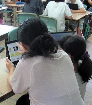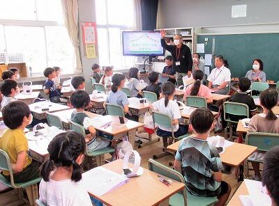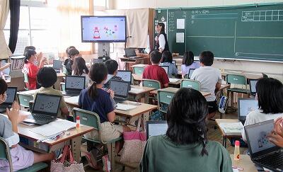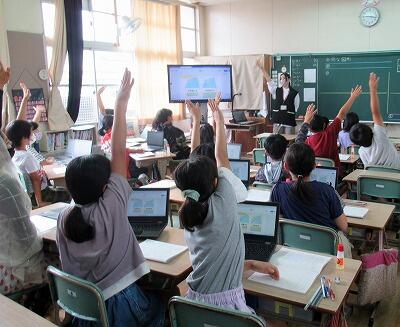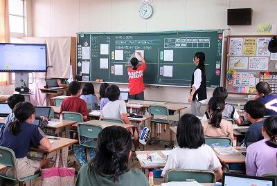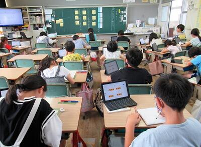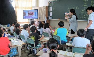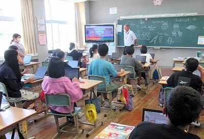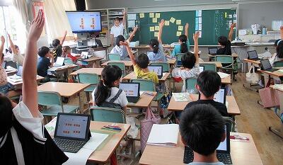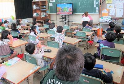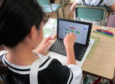 9月4日(月)、6年生の教室から楽しそうな声が聞こえてきます。外国語の時間で、夏休みを振り返る学習をしていました。ALTのペリー先生から英語の質問があって、答えをタブレットの4択で選んでいました。どこの国へ行ったのか、何をしたのか、首都はどこか・・・など。正解すると歓声があがっていました。