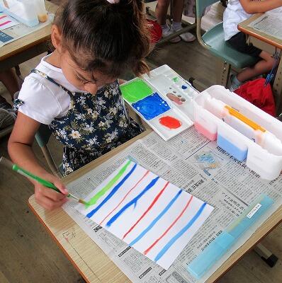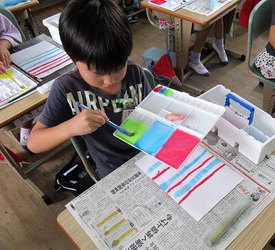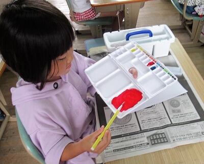 先週金曜日の3・4時間目。1年生が図工の学習で、絵の具の使い方を教えてもらっていました。道具のこと、パレットや筆の使い方など。一通り習ったら、色をぬるシミュレーションをしました。シミュレーションは完璧。先生がお手本で線を描くと「キャー!上手!!」という歓声があがりました。