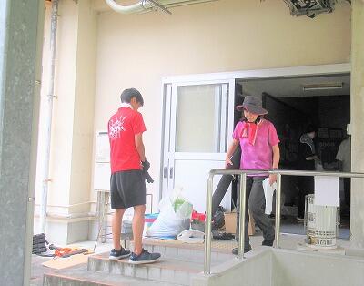 【清掃作業の様子】普段は清掃のできない倉庫やエレベーター、PTAルーム等の掃除や整理を行いました。中のものを一端全部出して、整理しました。見違えるほどすっきりしました。