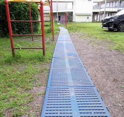 【リサイクルの道】使われていないマットがあったので、再利用しました。中庭が雨の日にぬかるんでいたので、子供たちが歩く専用の道をつくりました。これで子供たちが靴をぬらさないで通れるとよいです。