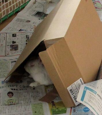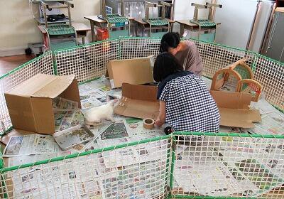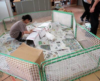 昨日、うさぎの「大福」を心配して、何人かの先生で様子を見に行きました。うさぎ小屋は金網のフェンスで囲まれているため、雨風が吹き付け、地面にも雨水がたまっていました。そこで、校舎内に緊急避難させました。大福が安心して過ごせるように、みんなで段ボールや新聞紙を使って小屋を再現しました。