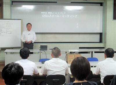 8月21日(月)に、高崎麓小学校の先生方と合同で、市教委主催の「教育長GIGAスクールミーティング」が本校で行われました。GIGAスクール構想の実現とICTの更なる活用に向けた教育長の想いを共有し、教育委員会と学校の連携・活性化を目的に開催されました。各学校のICT活用の取組について発表をした後に、児玉教育長から講話がありました。
