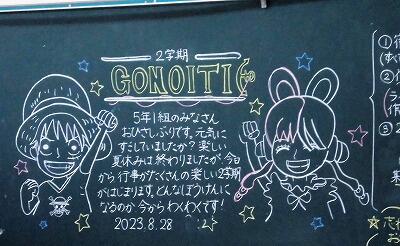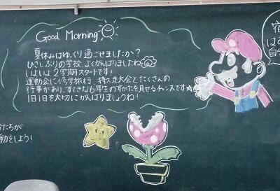 8月28日(月)、2学期が始まり、学校に子供たちの元気な声が戻ってきました。朝の教室では、黒板に先生からの温かいメッセージが描かれていました。学校に来てくれてありがとう、皆でがんばろうという言葉が迎えていました。