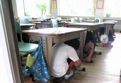 9月1日(金)防災の日に、震度7の地震を想定した避難訓練を実施しました。これまでは運動場に避難していましたが、今回は大きな地震で避難経路にがれき等が散乱し危険であるため、耐震補強が施されている校舎内で待機しました。地震発生とともに、子供たちは机の下に潜って揺れが収まるまで身を守ります。余震が続くことを想定し、余震のアラートを鳴らし数回訓練しました。その間、先生たちは子供たちが安心できるように声かけを行いました。