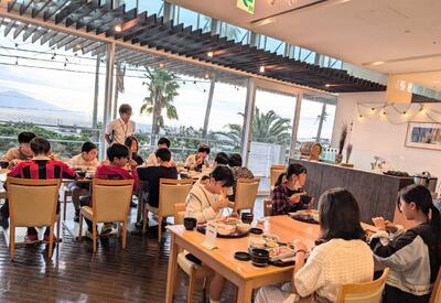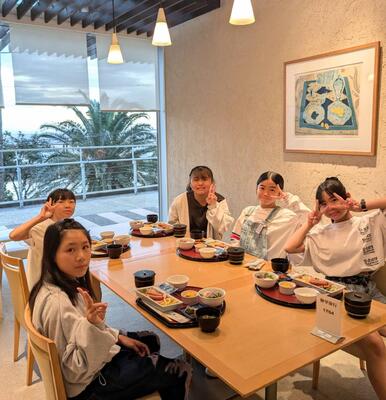 2日目スタートです。朝からみんな元気いっぱいです!桜島を見ながら朝食を食べています。日差しもでてきて、すがすがしい朝です。