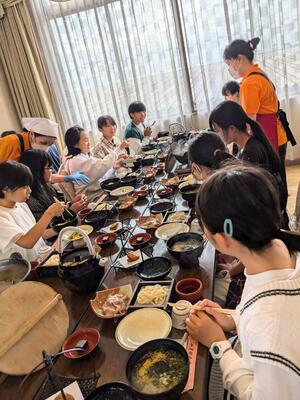 お待ちかねの昼食です。みんなお腹ペコペコのようです。正調さつま料理熊襲亭で、鹿児島の郷土料理の昼食です。きびなご、とんこつ、さつま汁・・・美味しくいただいています。
