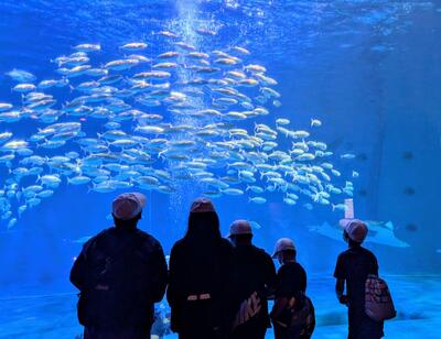 1日目の最後の訪問地「かごしま水族館」です。毎年、子供たちが楽しみにしている見学地の一つです。大水槽に泳ぐジンベイザメやイルカショーに感動していました。たくさんの魚に囲まれながら、子供たちの目がキラキラ輝いています。