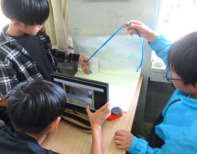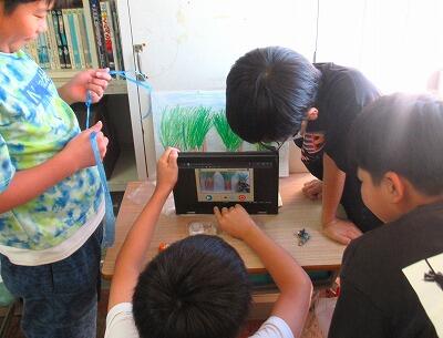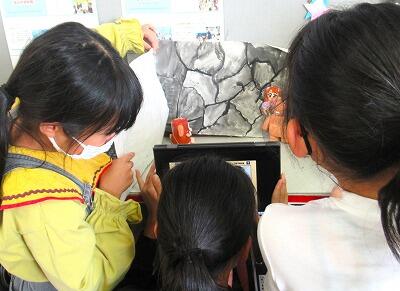 5年生が、図画工作の授業で「クレイアニメーション」を作っています。紙粘土で作ったキャラクターを少しずつ動かして、タブレット端末で写真を何枚も撮影する「コマ撮り」の技法で、アニメーションを作成しています。昔の「ぱらぱらマンガ」のように、映像を見るとキャラクターが動いているように表現できます。子供たちは、協力して夢中になって取り組んでいました。アニメーションの完成が楽しみです。