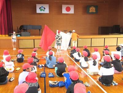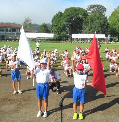 9月19日(木)、運動会に向けて結団式を行いました。まずは、スローガン発表がありました。子供たちが考えた今年のスローガンは「赤白全力できそい合い 応えんしあう 五気っ子オリンピック」です。