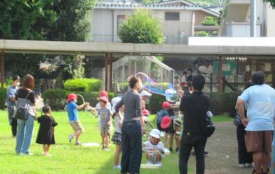 【1年生】都城高専から2名講師に来ていただき、「大きなシャボン玉」と「スライム」をつくりました。とても大きなシャボン玉ができて嬉しそうでした。